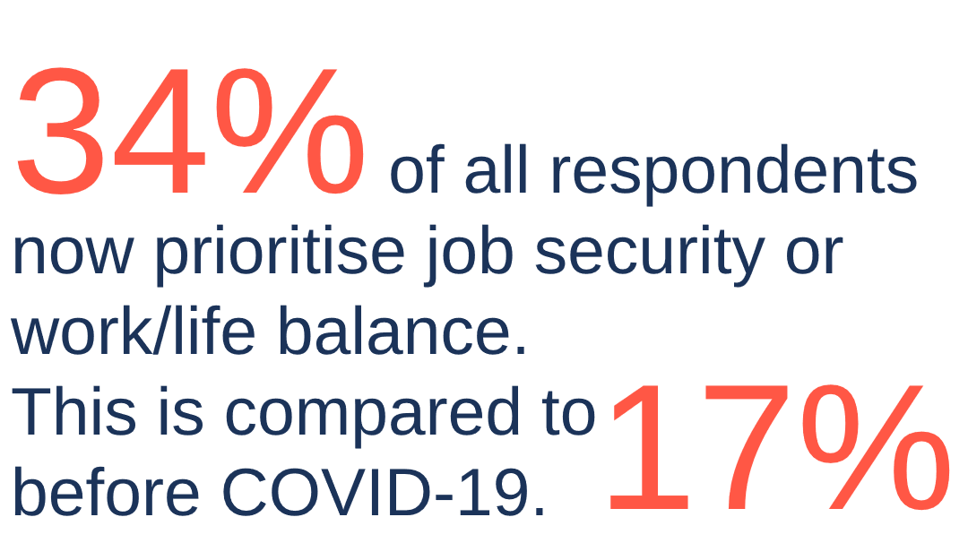 As we can see, 62% of those who have changed their career priorities because of COVID-19 now rank job security or work/life balance as their most important career considerations.